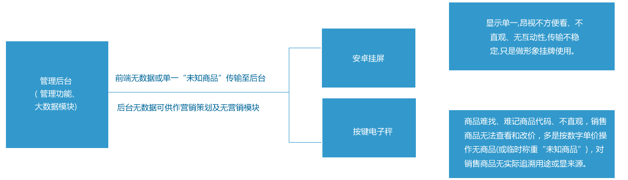 2.2 | 收銀前端操作 | 按鍵稱重,無(wú)法顯示,消費(fèi)不透明、不直觀、隨意性強(qiáng)、缺斤少兩難以杜絕;同時(shí)也造成商戶當(dāng)作普通電子秤使用,無(wú)法采集到任何銷售數(shù)據(jù),跟傳統(tǒng)電子秤購(gòu)買沒(méi)有任何區(qū)別(浪費(fèi)投入)。 | 操作簡(jiǎn)單點(diǎn)圖稱重即可消費(fèi);又能實(shí)現(xiàn)收銀超市化,單品稱重、多品連續(xù)稱重、結(jié)帳、改單、退換貨、掛賬、會(huì)員折扣、會(huì)員積份、促銷活動(dòng)、報(bào)損、采購(gòu)、調(diào)貨等直接操作性強(qiáng);無(wú)法違規(guī)操作,杜絕缺斤少兩;消費(fèi)更直觀、更透明、真正做到公平消費(fèi),增強(qiáng)消費(fèi)者信心和體驗(yàn)感。 |